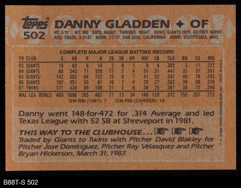 1988 Topps #502 Dan Gladden