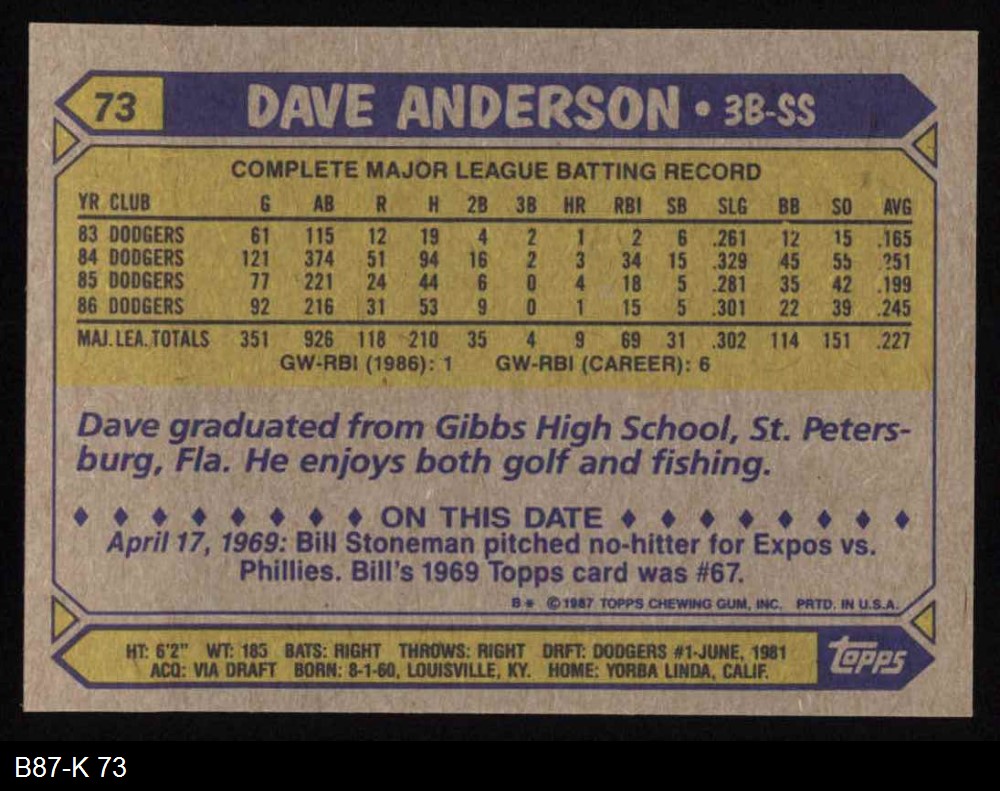 1987 Topps #73 Dave Anderson 8 - NM/MT