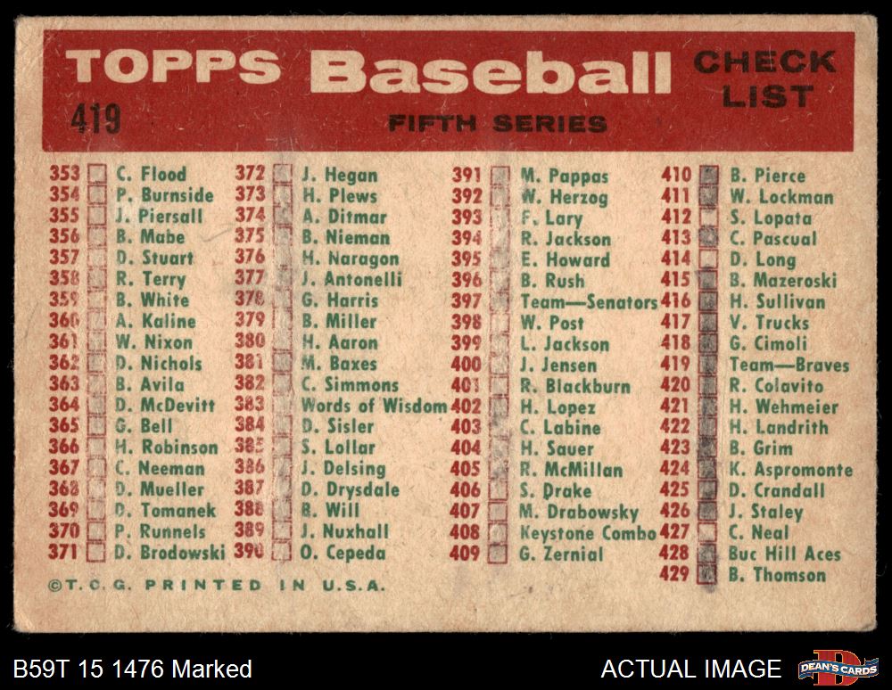 1959 Topps #419 Braves Team Checklist 1.5 - FAIR