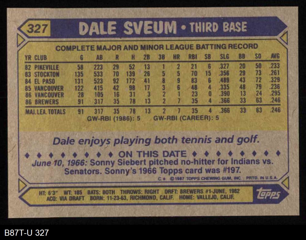 1987 Topps #327 Dale Sveum 8 - NM/MT
