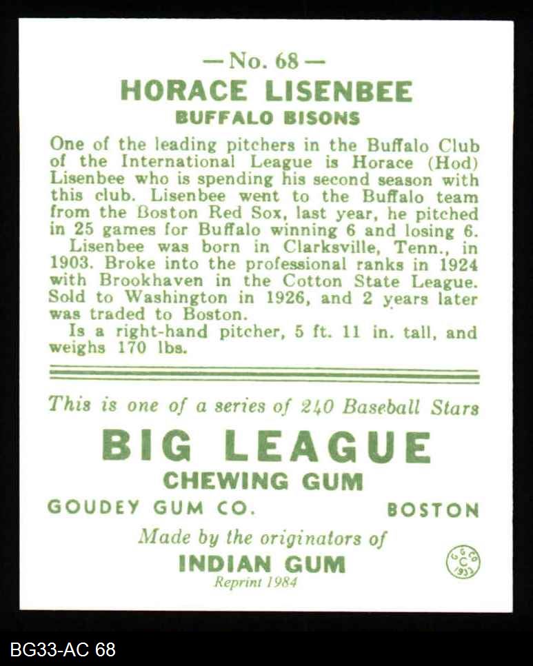 1933 Goudey Reprint #68 Horace Lisenbee 8 - NM/MT