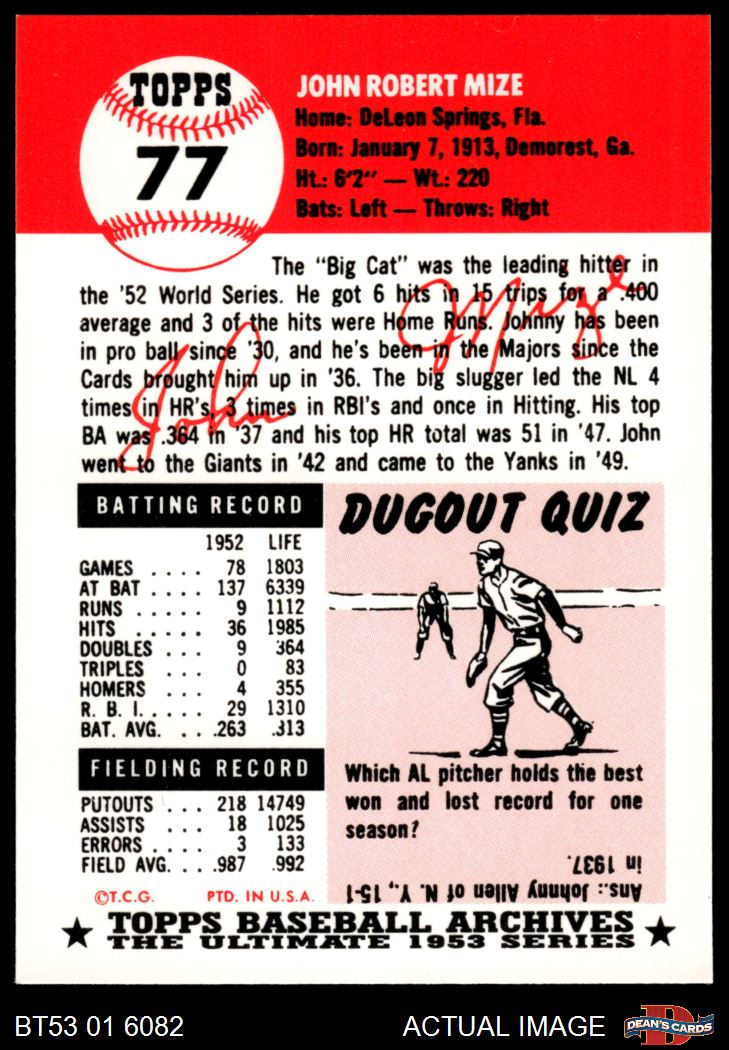 1953 Topps Archives #77 Johnny Mize 8 - NM/MT