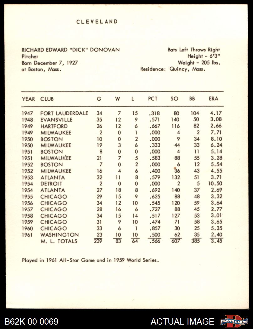 1962 Kahn's Dick Donovan 3 - VG