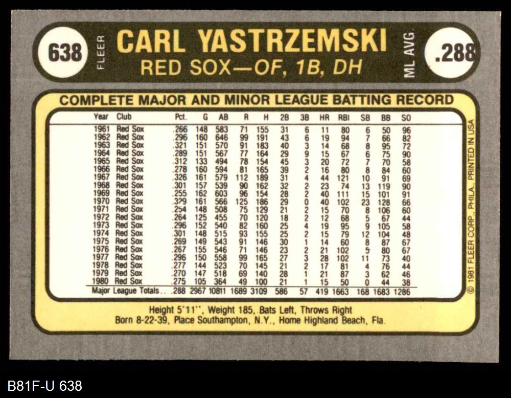 1981 Fleer #638 - Carl Yastrzemski 400 HOME RUN CLUB 8 - NM/MT