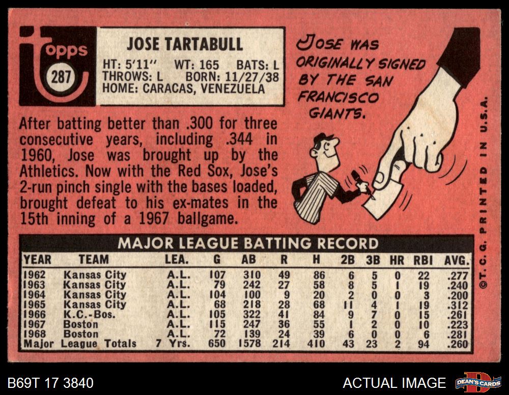 1969 Topps #287 Jose Tartabull 3 - VG
