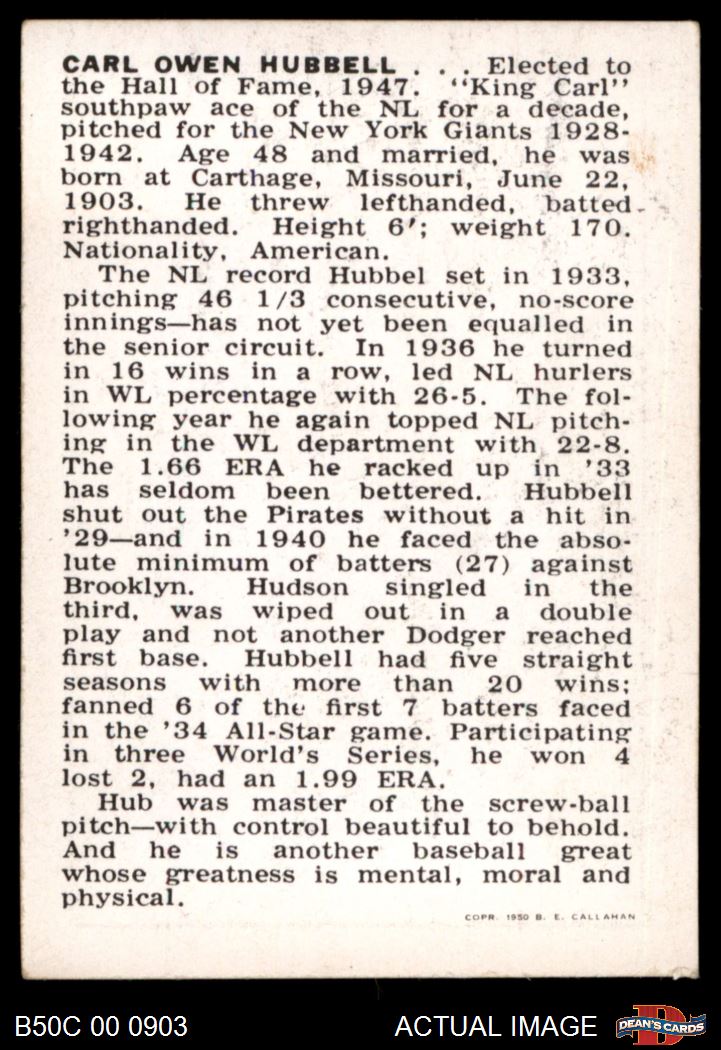 1950 Callahan Hall of Fame Carl Hubbell 6.5 - EX/MT+
