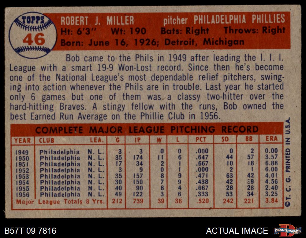 1957 Topps #46 Bob Miller 1 - POOR