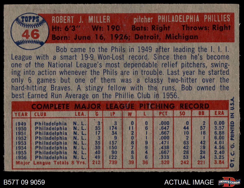 1957 Topps #46 Bob Miller 4 - VG/EX