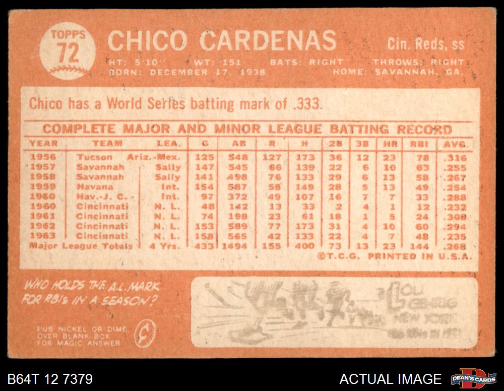 1964 Topps #72 Leo Cardenas 3 - VG