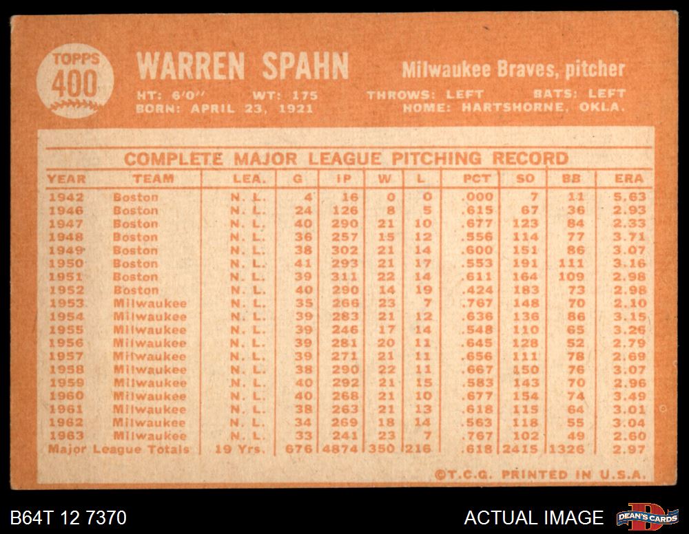1964 Topps #400 Warren Spahn 2 - GOOD