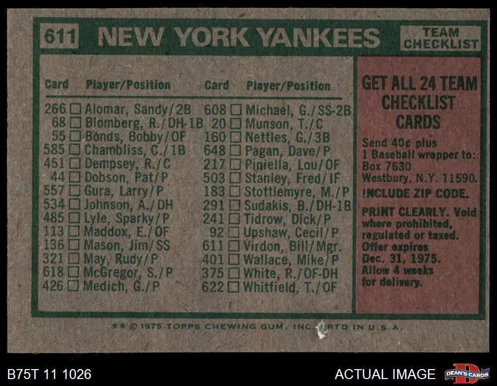 1975 Topps #611 Yankees Team Checklist