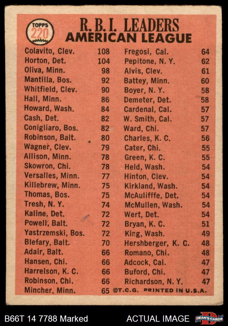 1966 Topps #220 - Rocky Colavito / Willie Horton / Tony Oliva AL RBI Leaders 1.5 - FAIR