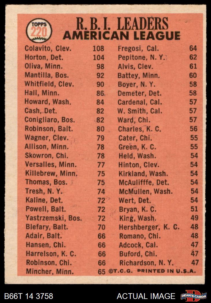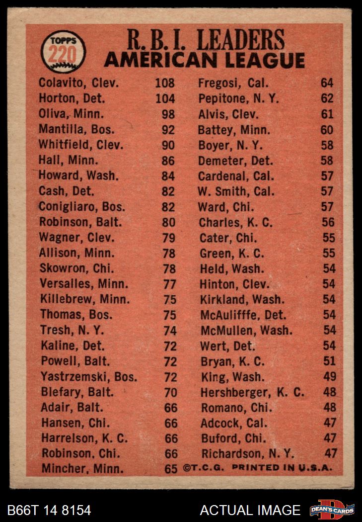 1966 Topps #220 - Rocky Colavito / Willie Horton / Tony Oliva AL RBI Leaders 3 - VG