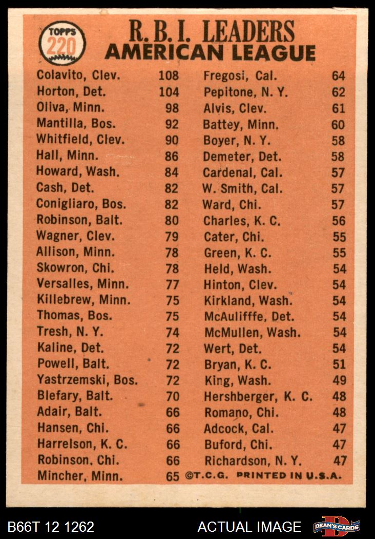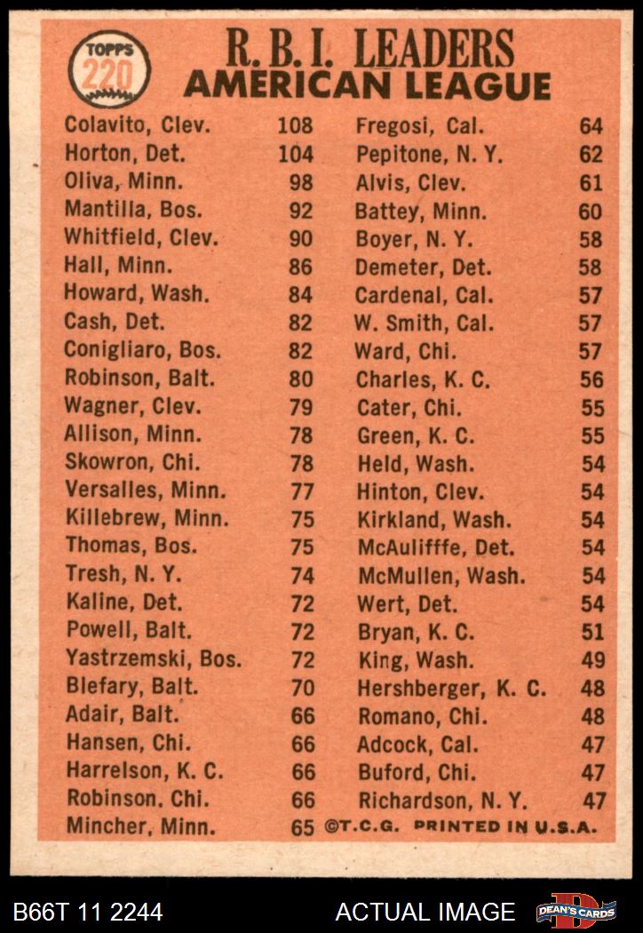 1966 Topps #220 - Rocky Colavito / Willie Horton / Tony Oliva AL RBI Leaders 8 - NM/MT