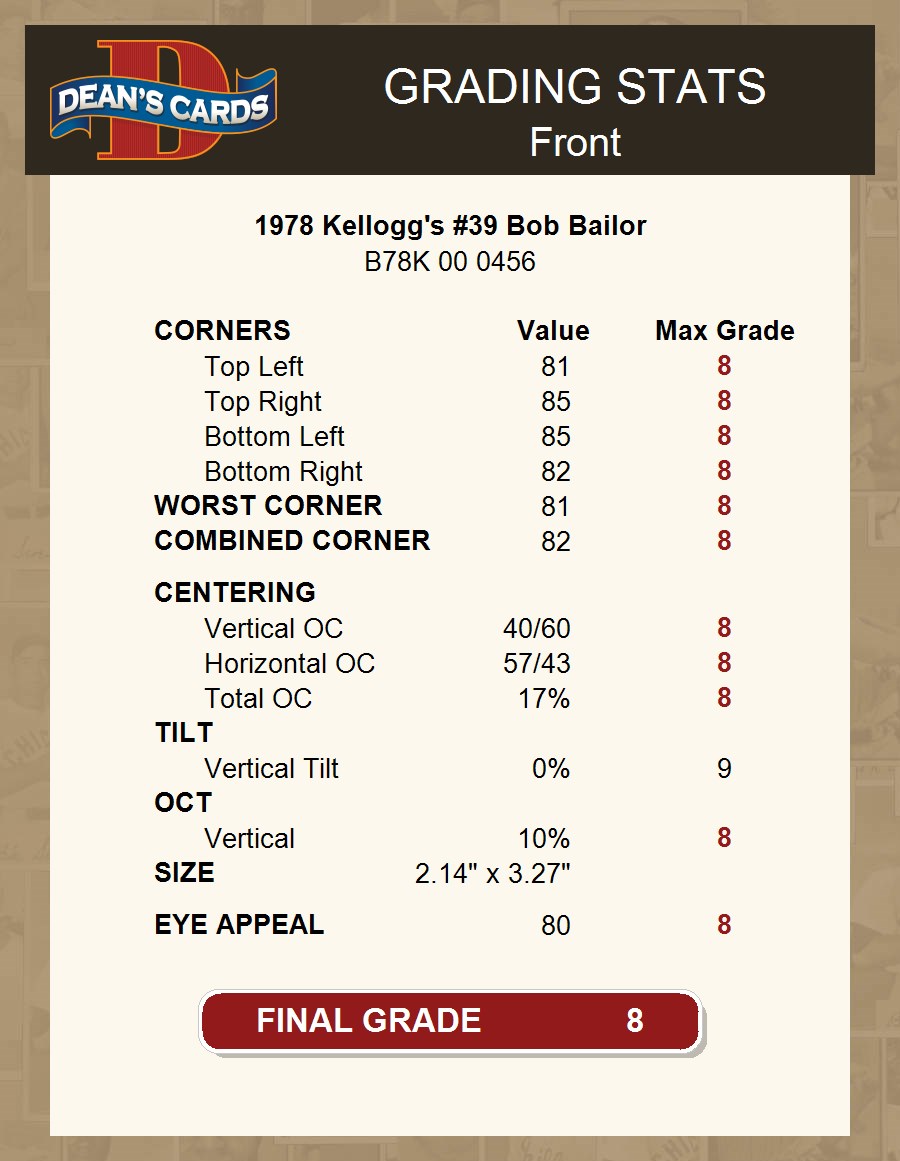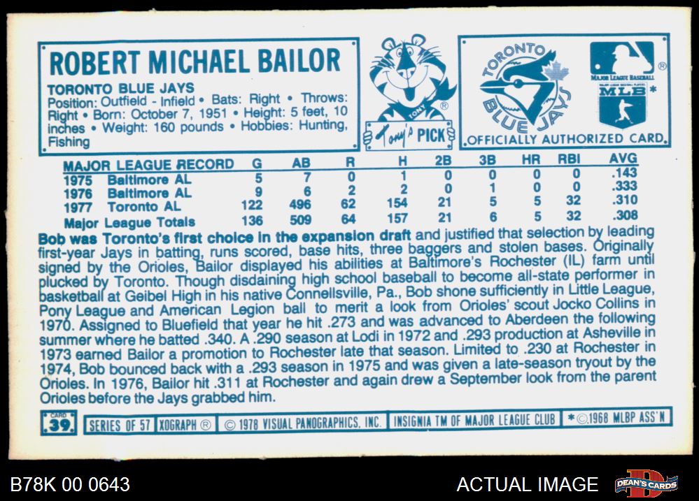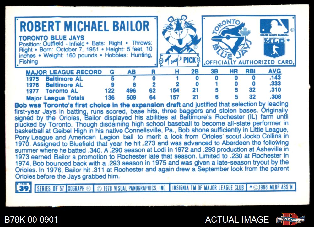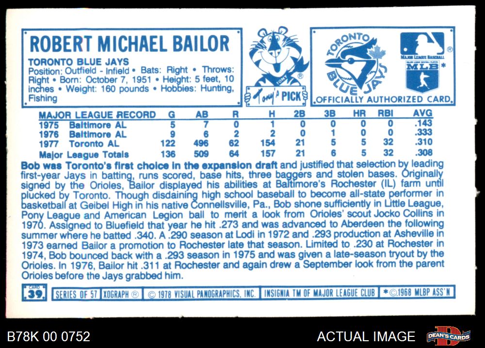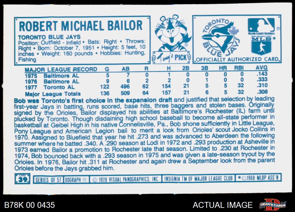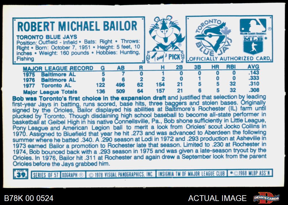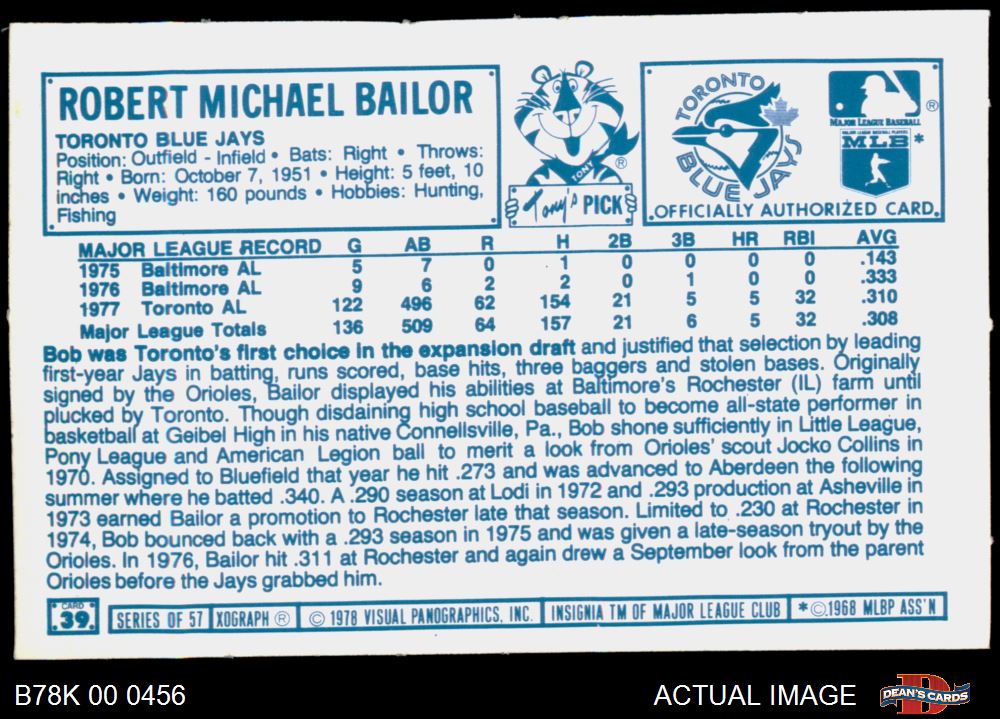 1978 Kellogg's #39 Bob Bailor