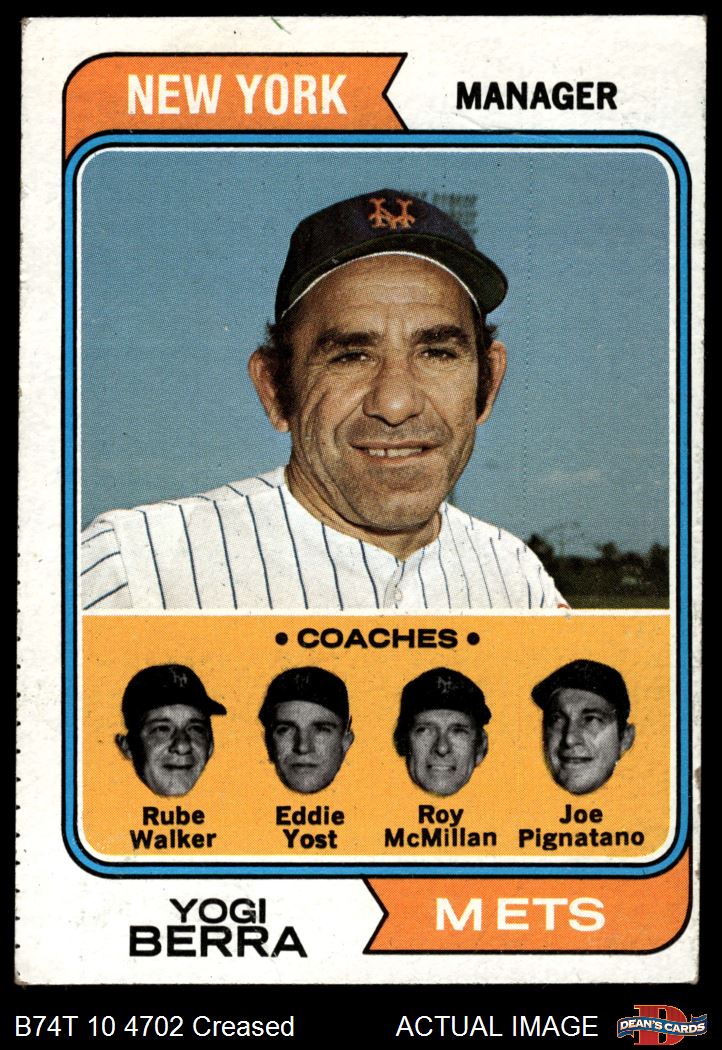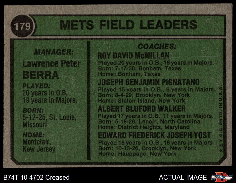 1974 Topps #179 - Yogi Berra / Roy McMillan / Joe Pignatano / Rube Walker / Eddie Yost Mets Leaders 3 - VG
