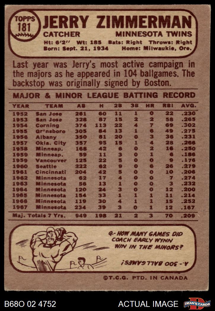 1968 O-Pee-Chee #181 Jerry Zimmerman 4 - VG/EX