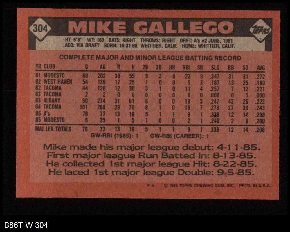 1986 Topps #304 Mike Gallego 8 - NM/MT