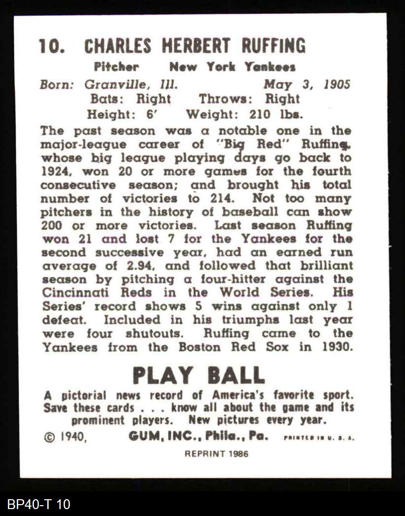 1940 Play Ball Reprint #10 Red Ruffing 8 - NM/MT