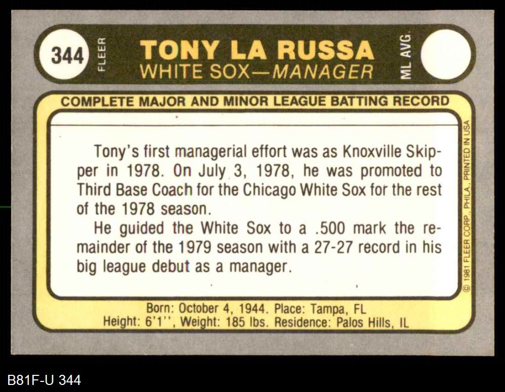 1981 Fleer #344 Tony La Russa 8 - NM/MT