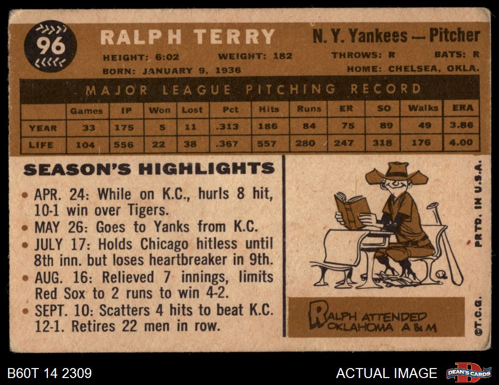 1960 Topps #96 Ralph Terry 1.5 - FAIR