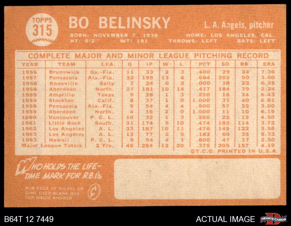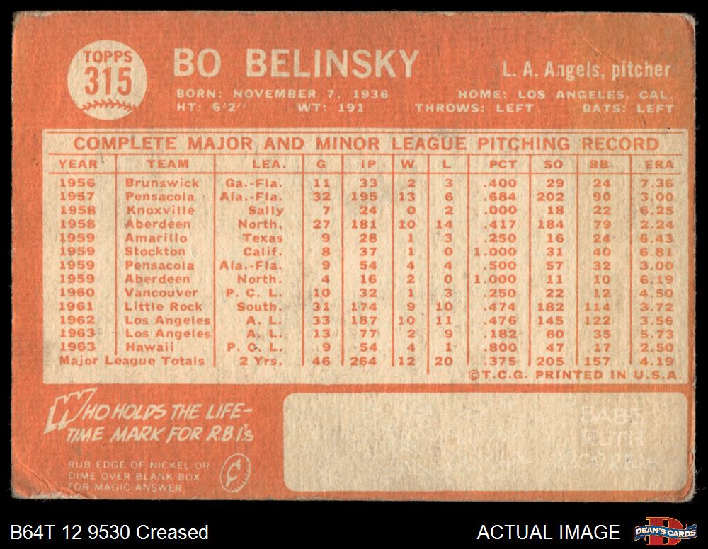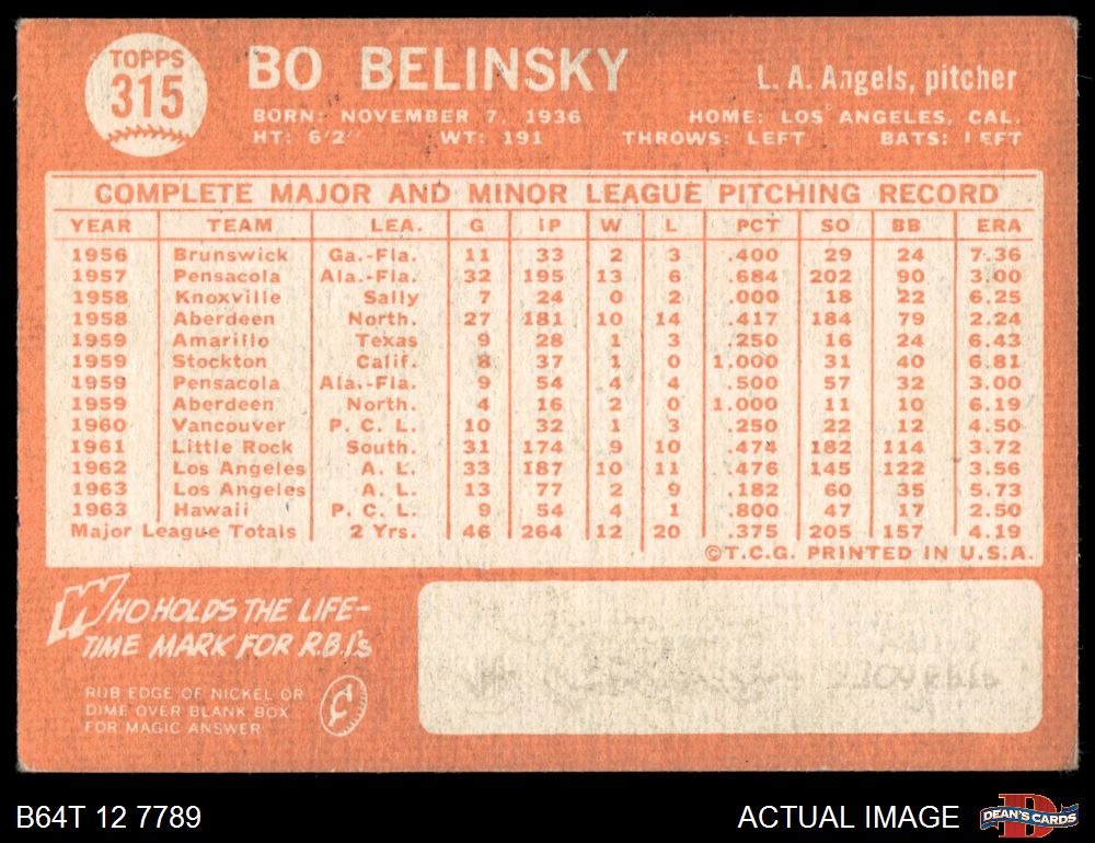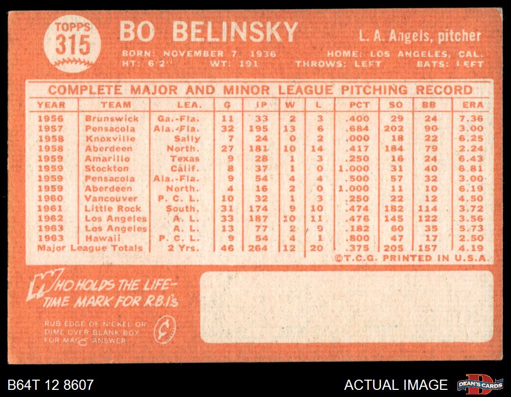 1964 Topps #315 Bo Belinsky