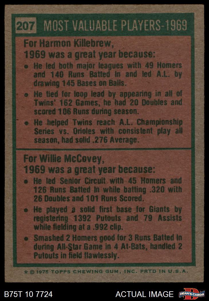 1975 Topps #207 - Harmon Killebrew / Willie McCovey 1969 MVPs 6.5 - EX/MT+