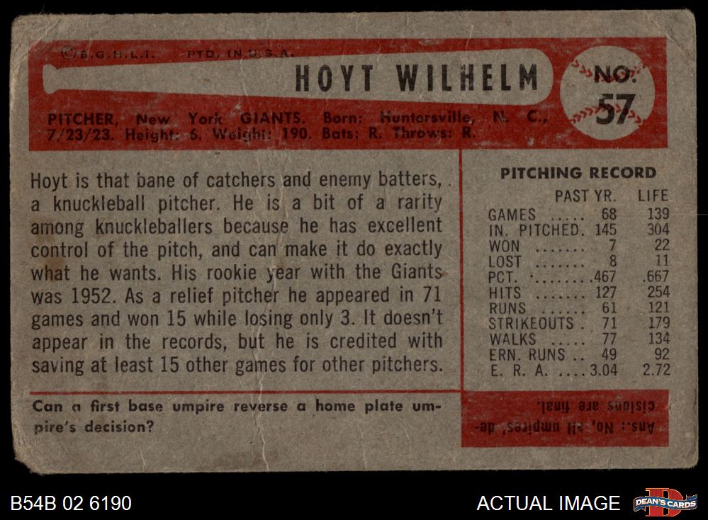 1954 Bowman #57 Hoyt Wilhelm AUTHENTIC