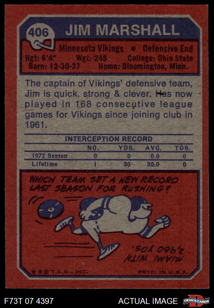 1973 Topps #406 Jim Marshall 8 - NM/MT