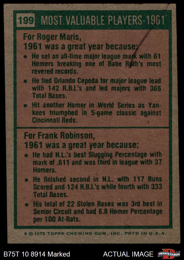 1975 Topps #199 - Roger Maris / Frank Robinson 1961 MVPs 1.5 - FAIR