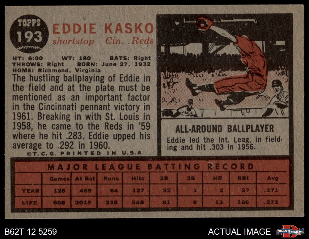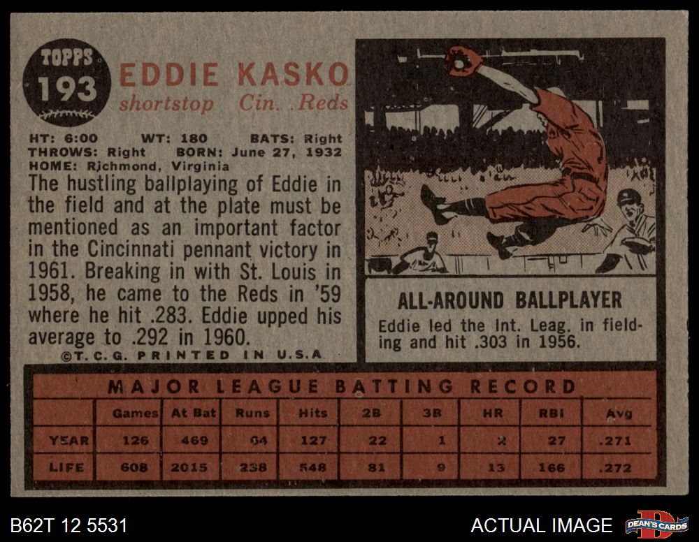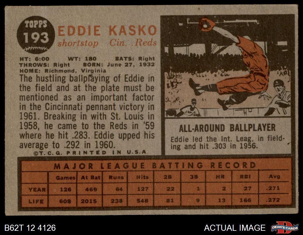 1962 Topps #193 NRM Eddie Kasko 4 - VG/EX