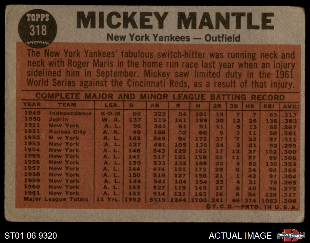 1962 Topps #318 - Mickey Mantle The Switch Hitter Connects 1 - POOR