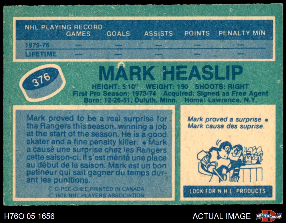 1976 O-Pee-Chee NHL #376 Mark Heaslip 6 - EX/MT