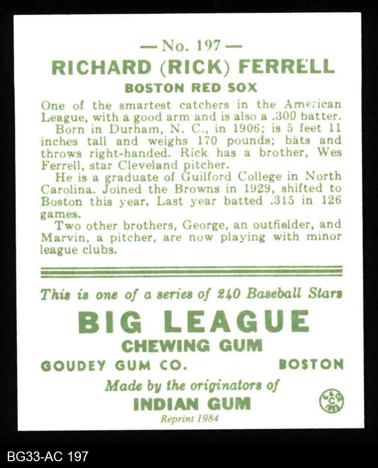 1933 Goudey Reprint #197 Rick Ferrell 8 - NM/MT