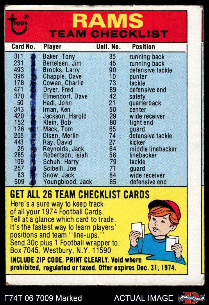 1974 Topps Checklist Los Angeles Rams Team 1 - POOR