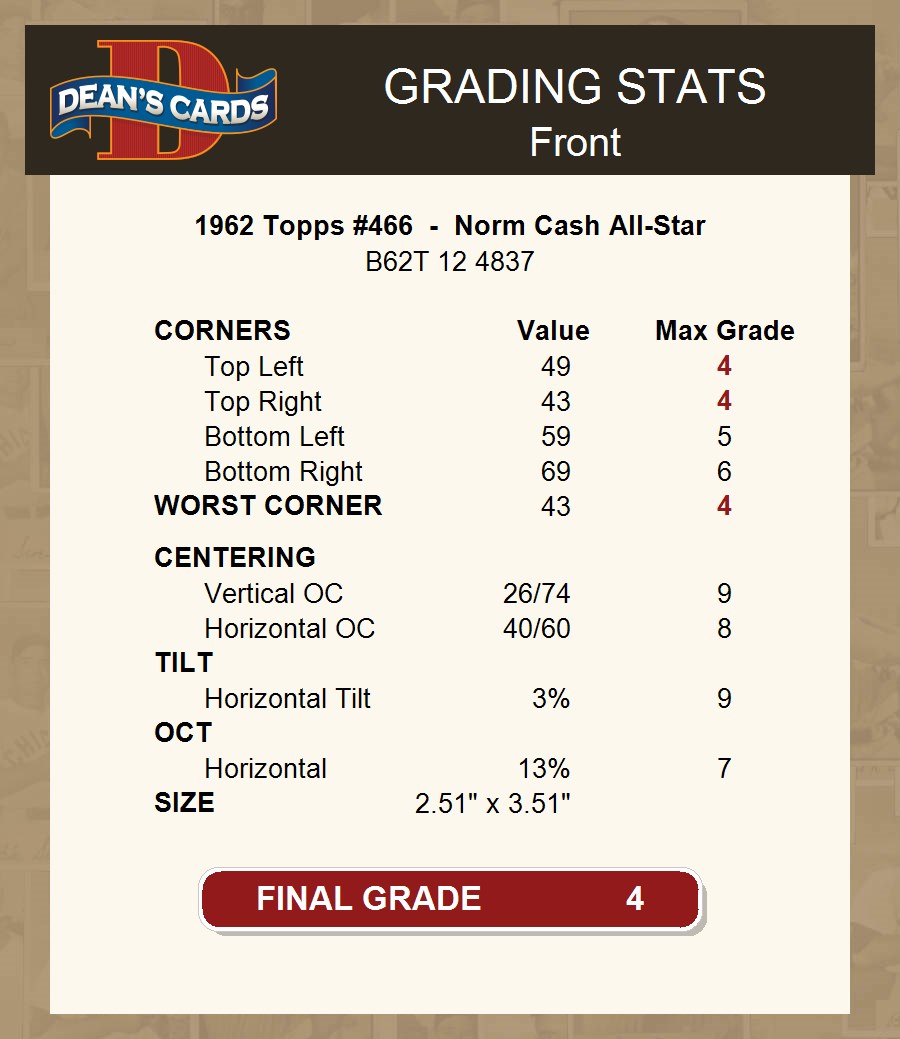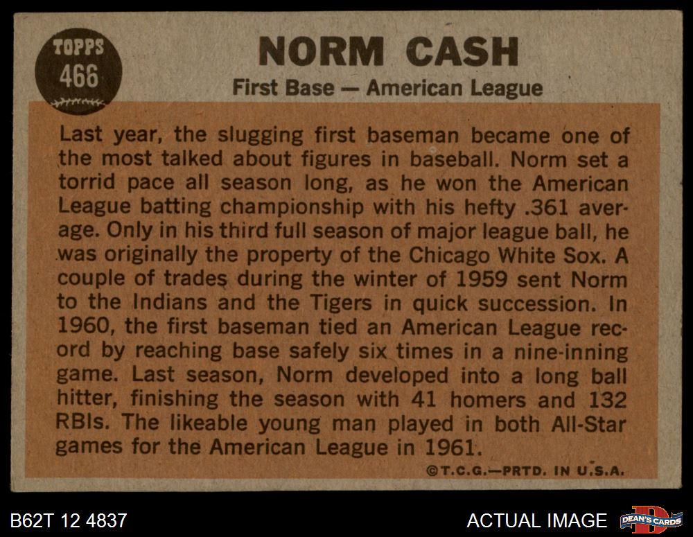 1962 Topps #466 - Norm Cash All-Star 4 - VG/EX