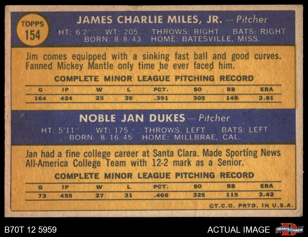 1970 Topps #154 - Jan Dukes / Jim Miles Senators Rookies 4 - VG/EX