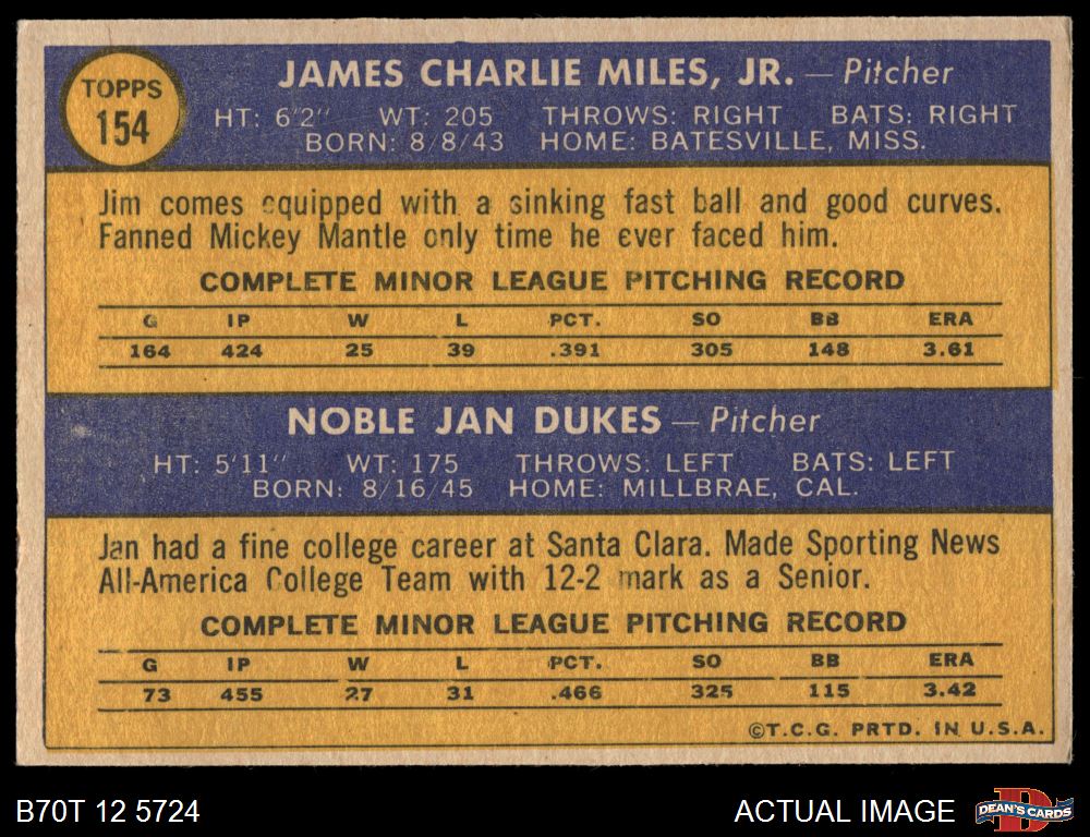 1970 Topps #154 - Jan Dukes / Jim Miles Senators Rookies 5 - EX