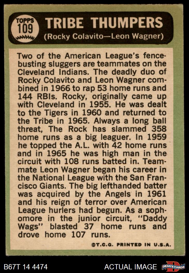 1967 Topps #109 - Rocky Colavito / Leon Wagner Tribe Thumpers 4 - VG/EX