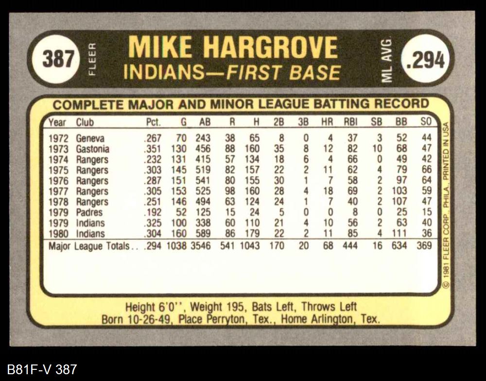 1981 Fleer #387 Mike Hargrove 8 - NM/MT