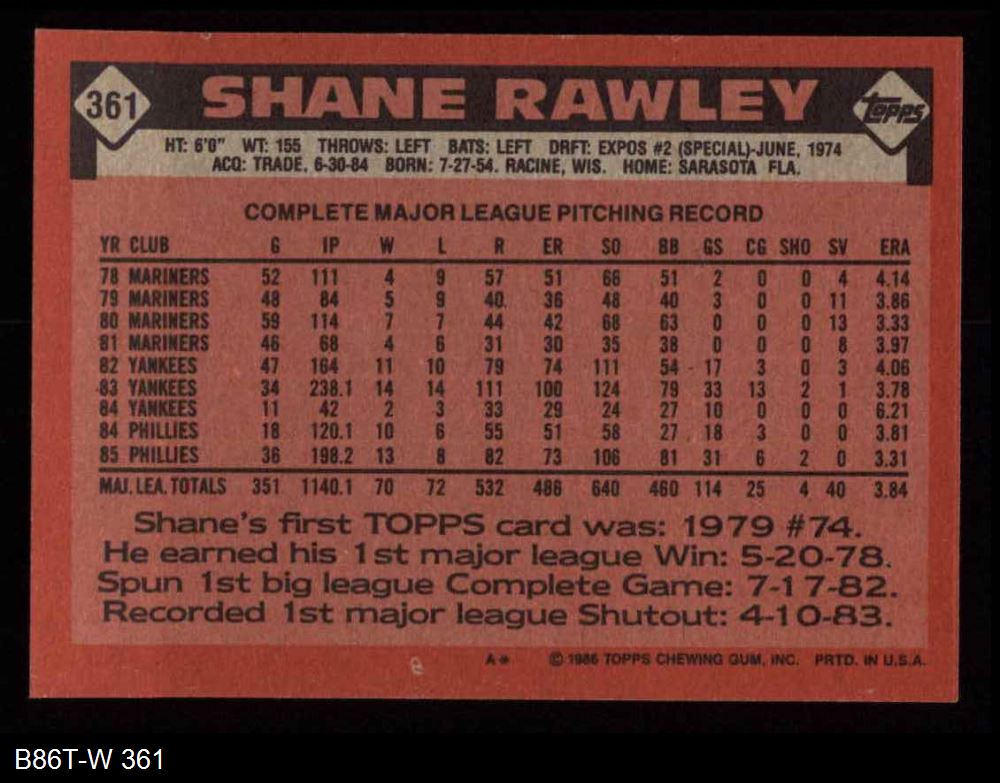 1986 Topps #361 Shane Rawley