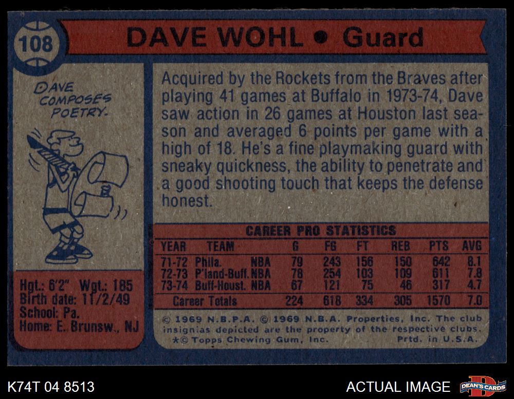 1974 Topps #108 Dave Wohl 4 - VG/EX