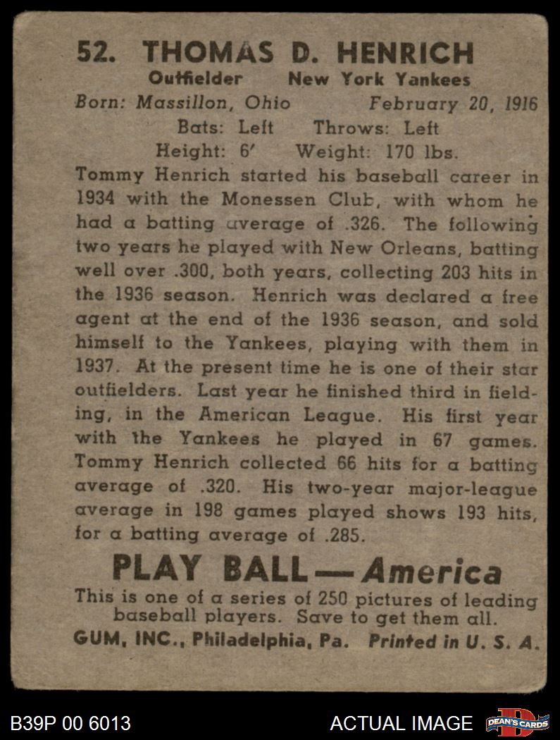 1939 Play Ball #52 Tommy Henrich 2 - GOOD