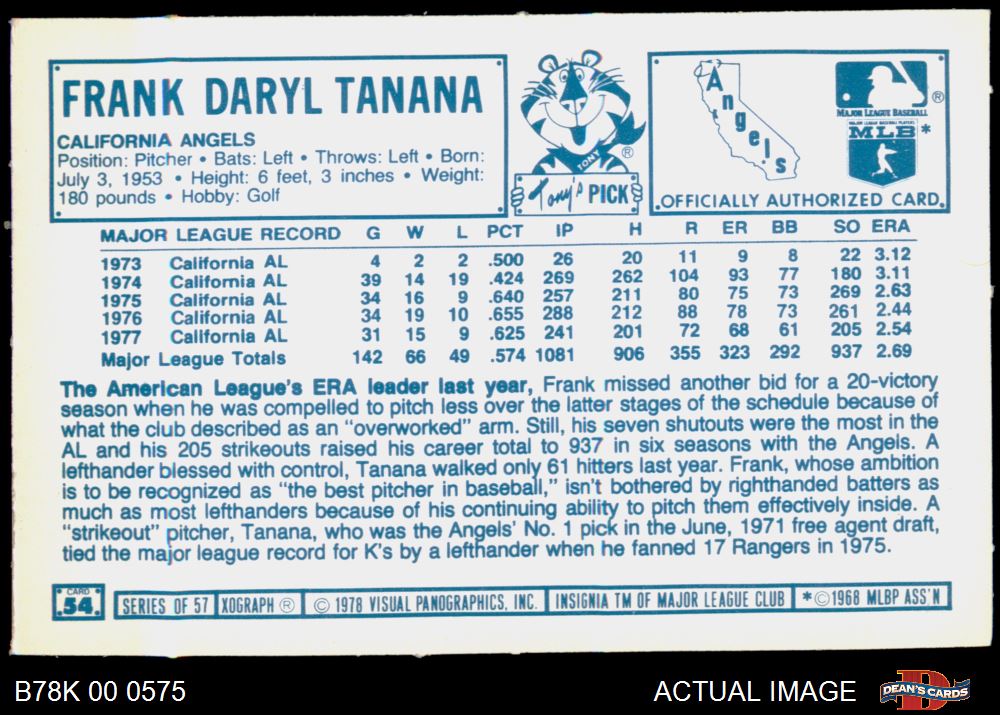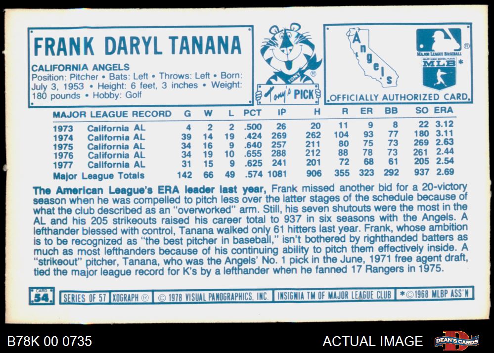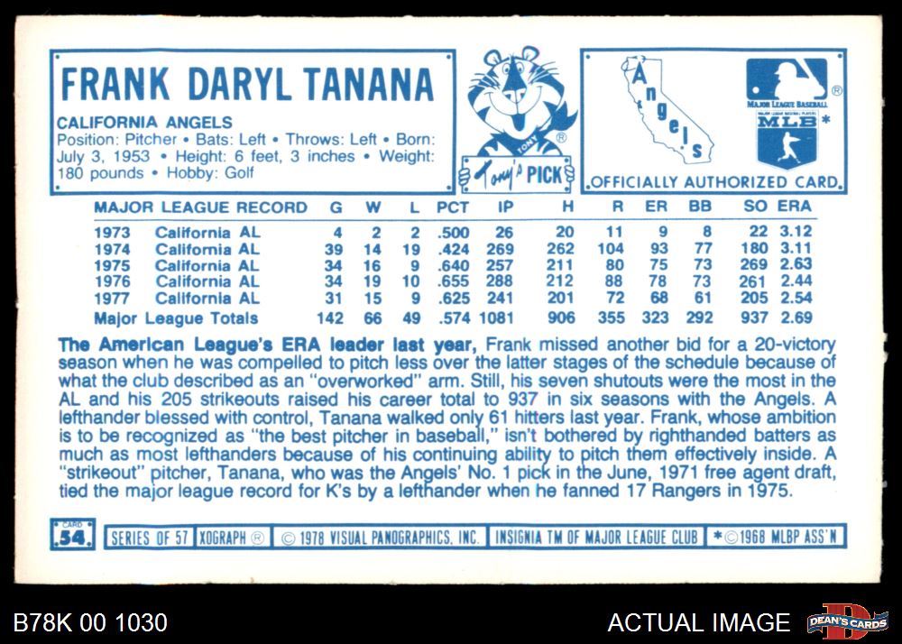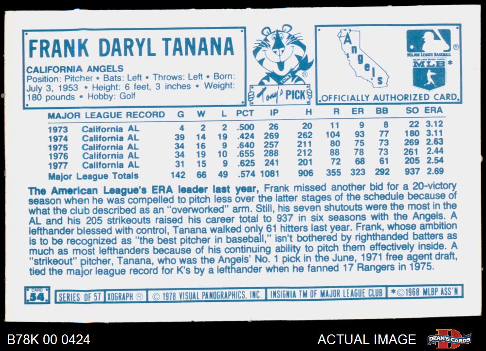 1978 Kellogg's #54 Frank Tanana 8 - NM/MT