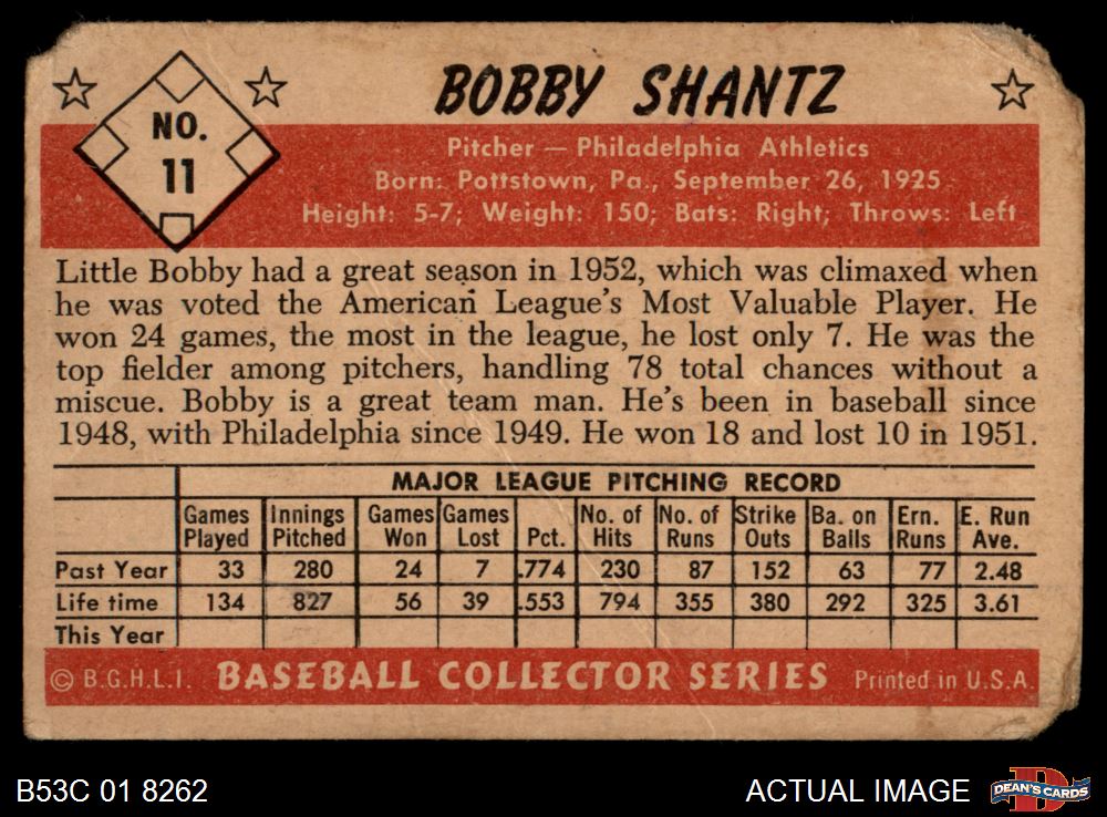 1953 Bowman #11 Bobby Shantz AUTHENTIC