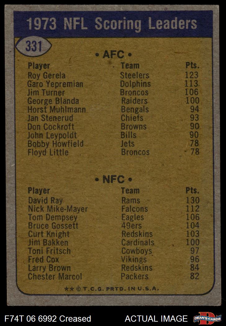 1974 Topps #331 - Roy Gerela / David Ray Scoring Leaders 3 - VG