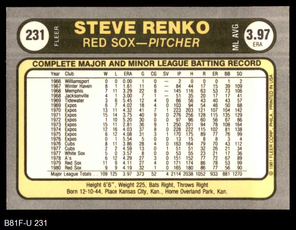 1981 Fleer #231 Steve Renko