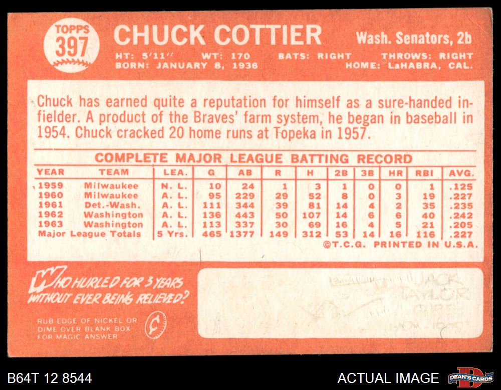 1964 Topps #397 Chuck Cottier 4 - VG/EX