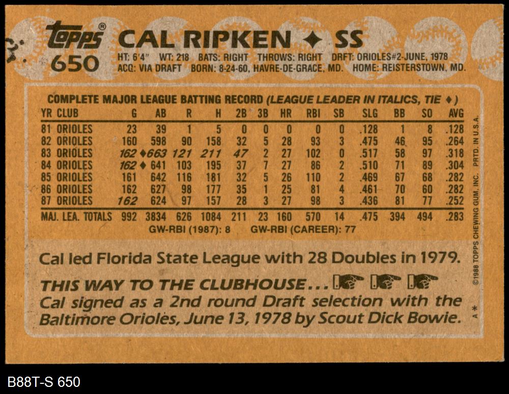 1988 Topps #650 Cal Ripken Jr. 8 - NM/MT