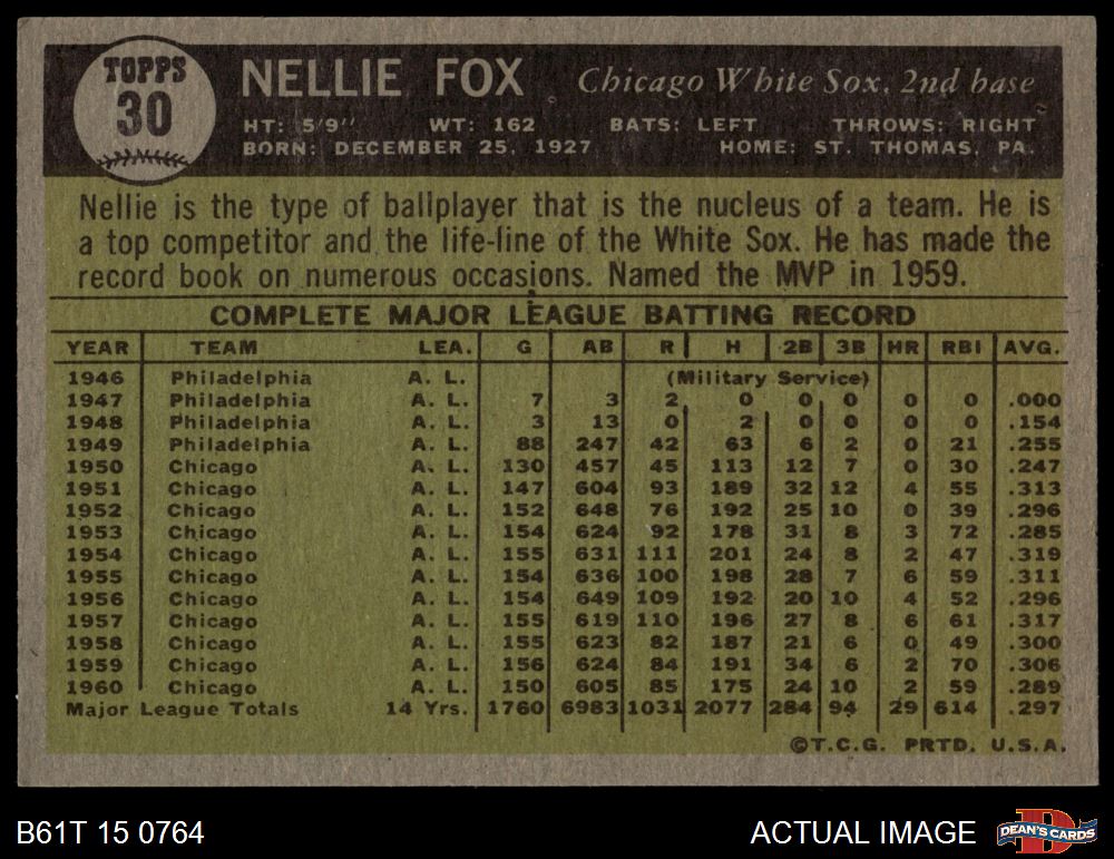 1961 Topps #30 Nellie Fox 4 - VG/EX